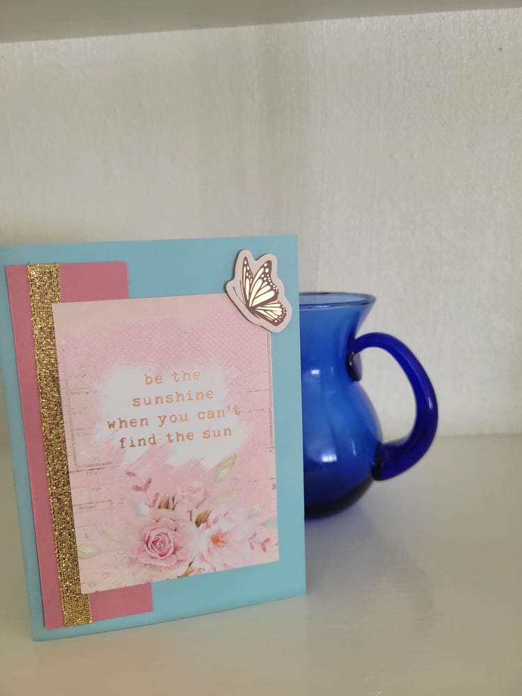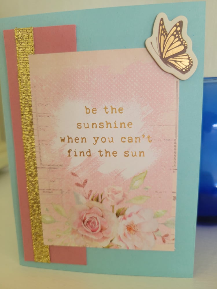 It reads "be the sunshine when you can't find the sun" in gold foil.