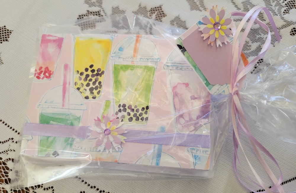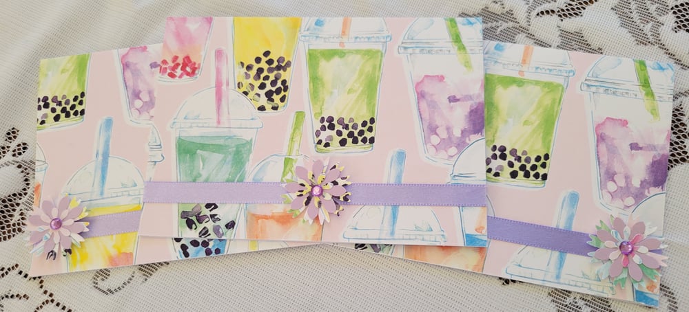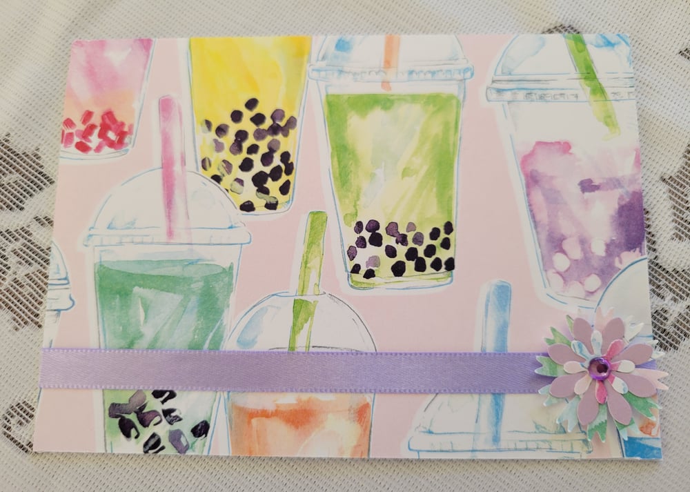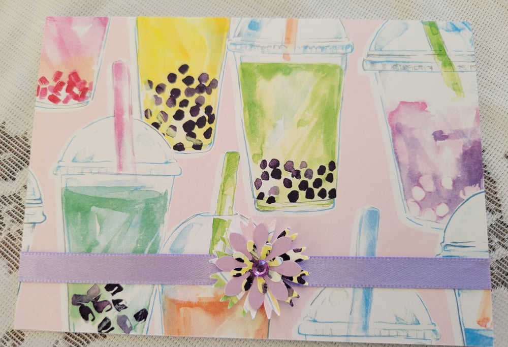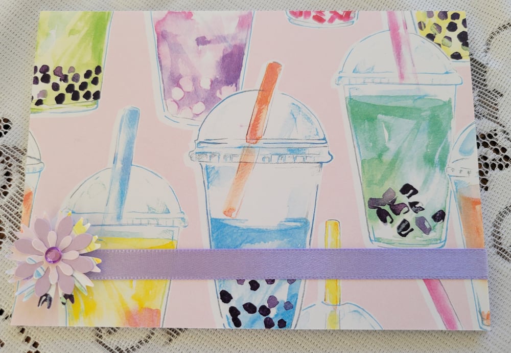 Design is as pictured- front of card is pink with different pastel colored bubble teas. Embellished with a lavender satin ribbon and a coordinating 3D flower with a lavender rhinestone embellishment on the left, right, or in the middle.