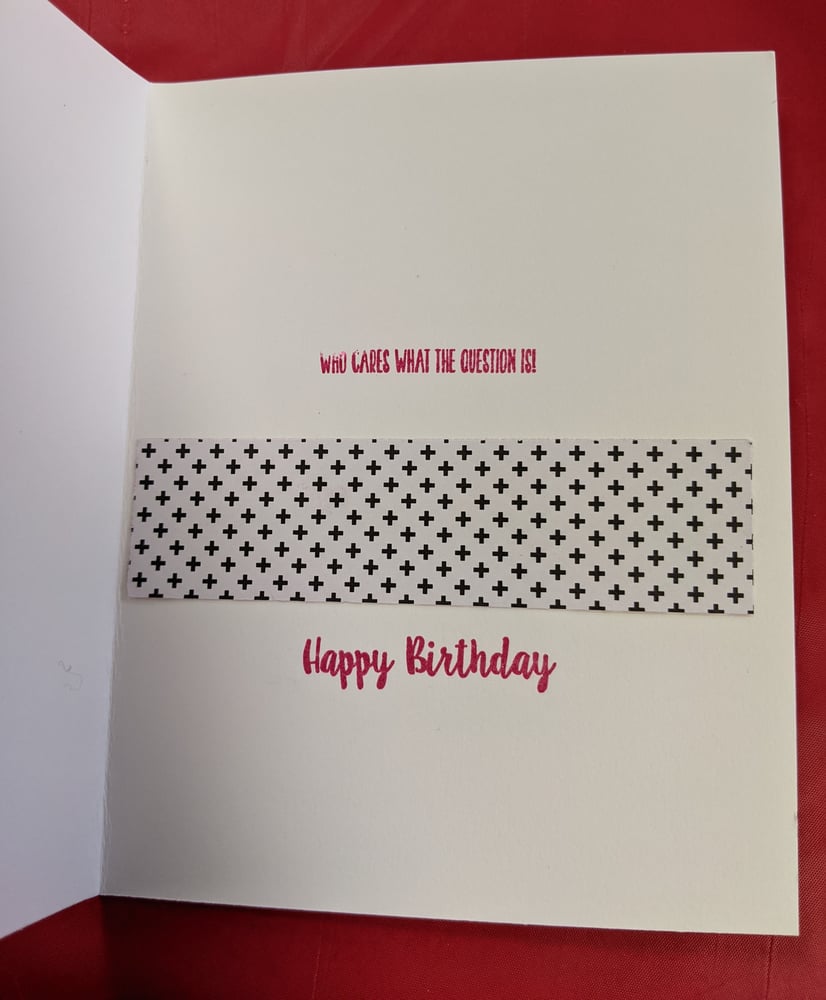 The inside of the card says "who cares what the question is!" and "happy birthday," as pictured.