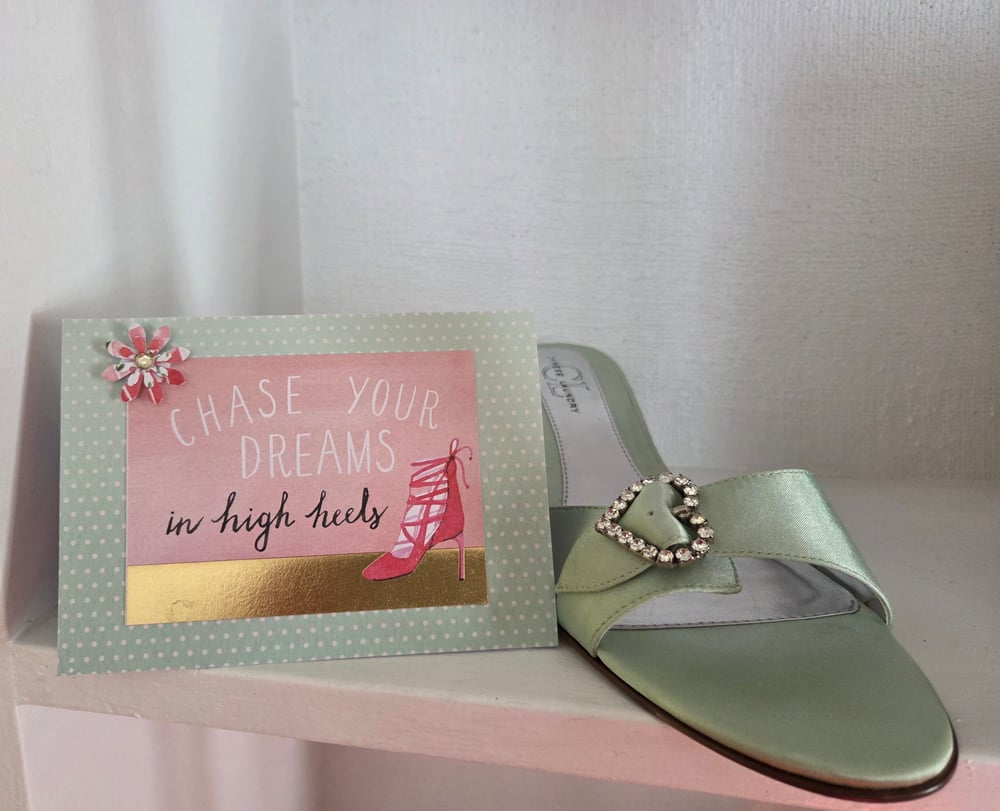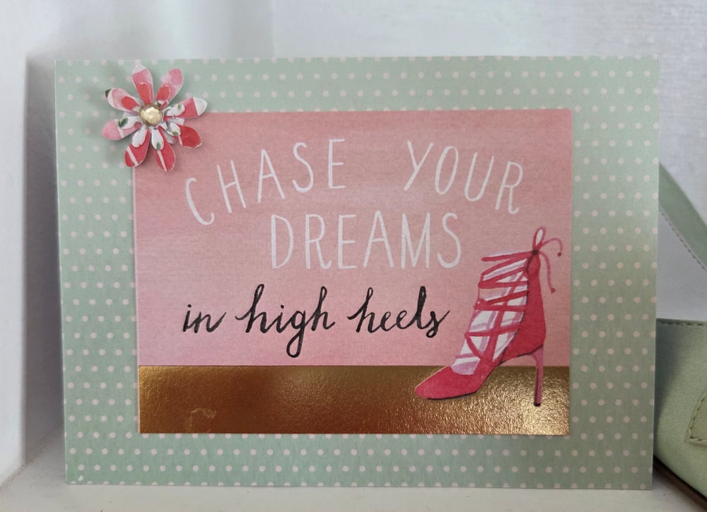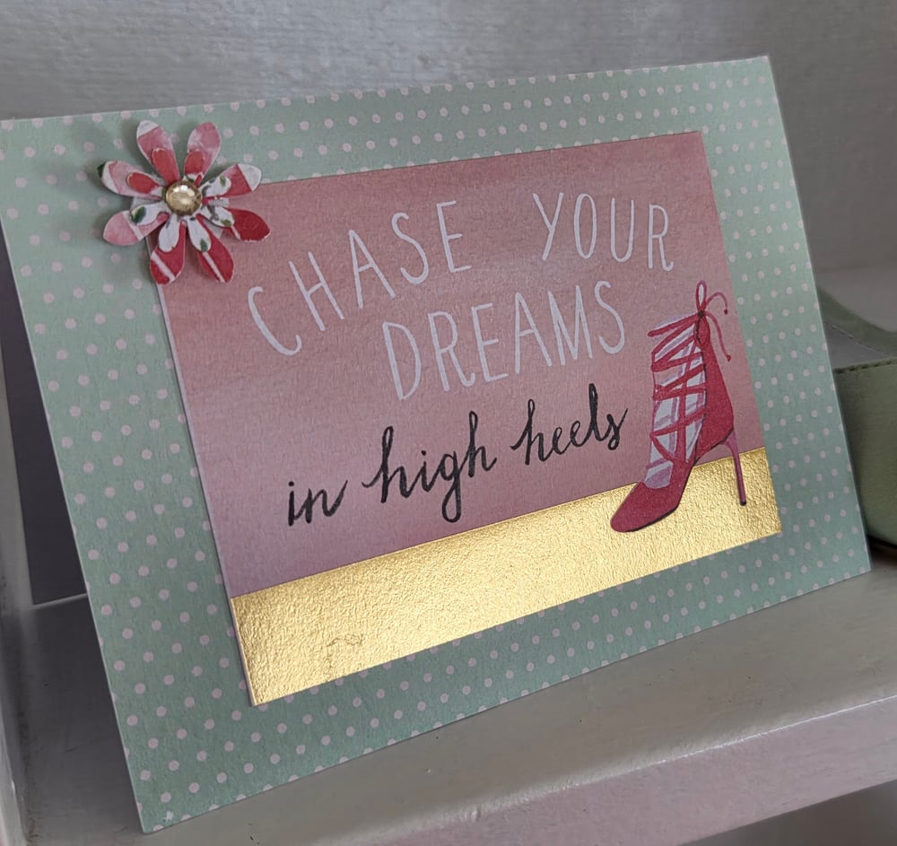 Design is as pictured- a pink and shiny gold foil design that sits atop mint green with white tiny polka dots. The front of the card reads "Chase your dreams in high heels", and there's a picture of a single hot pink heel. The front also includes a handmade 3D flower embellishment with a coordinating rhinestone.