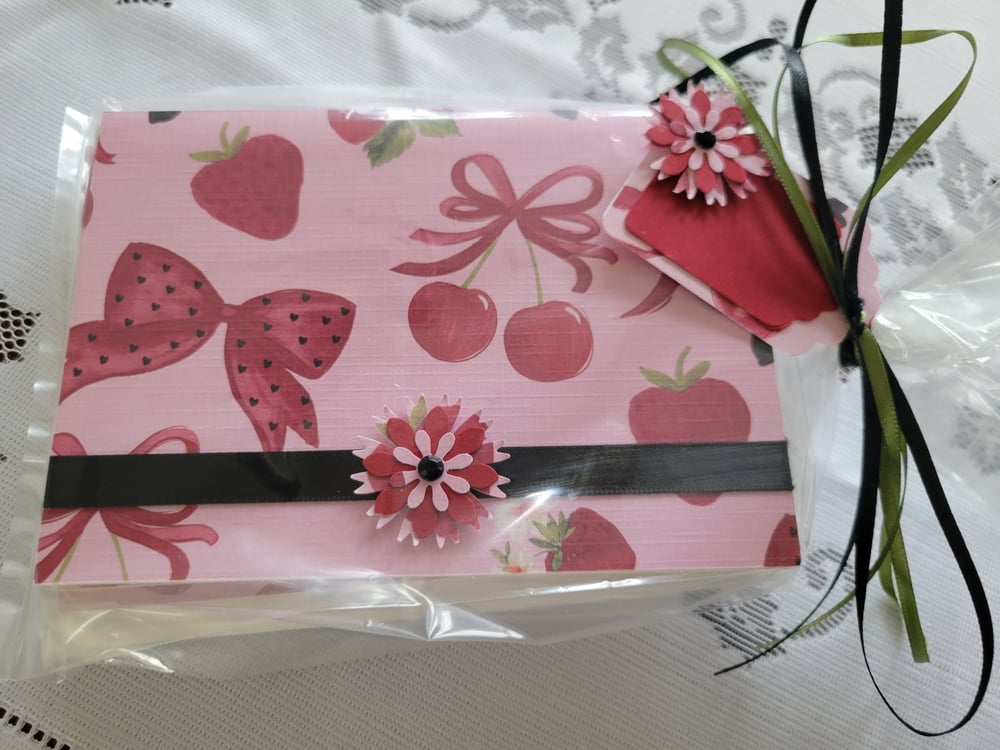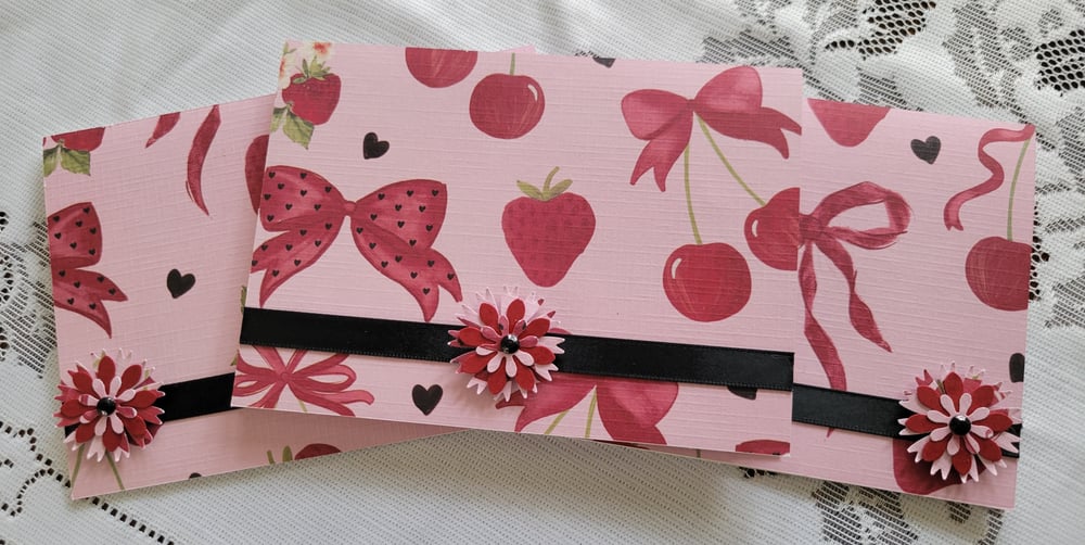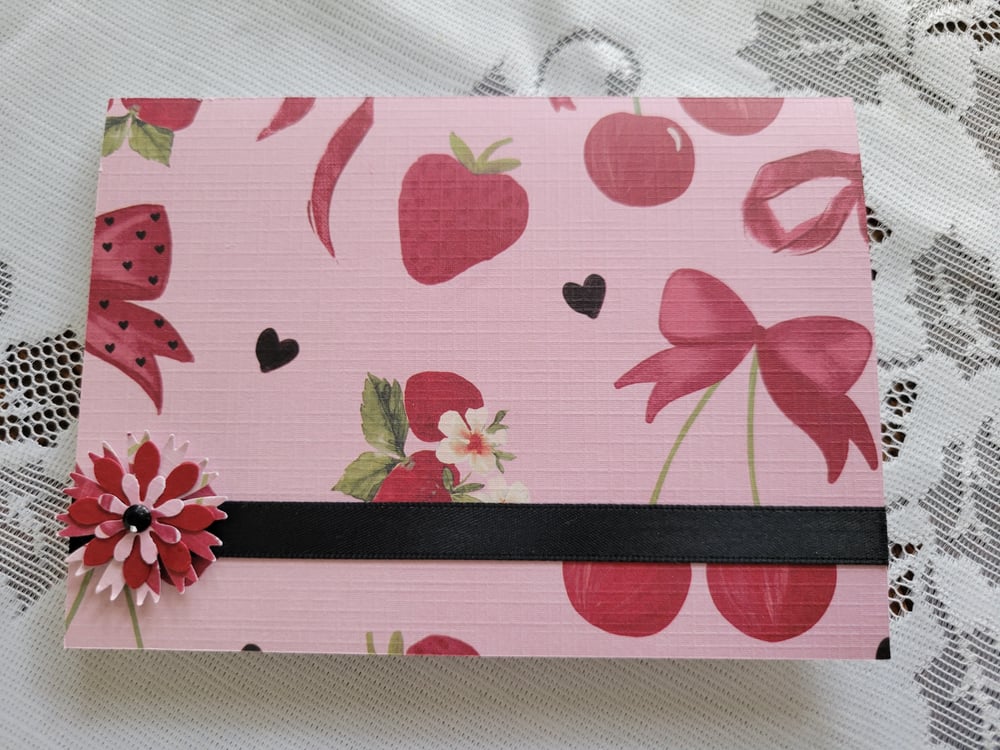 Design is as pictured- front of card is pink with red cherries, red strawberries, red and black bows, and little black hearts. Embellished with a black satin ribbon and a coordinating 3D flower on the left, right, or in the middle.