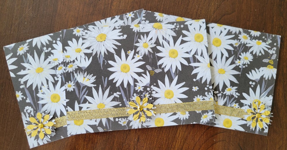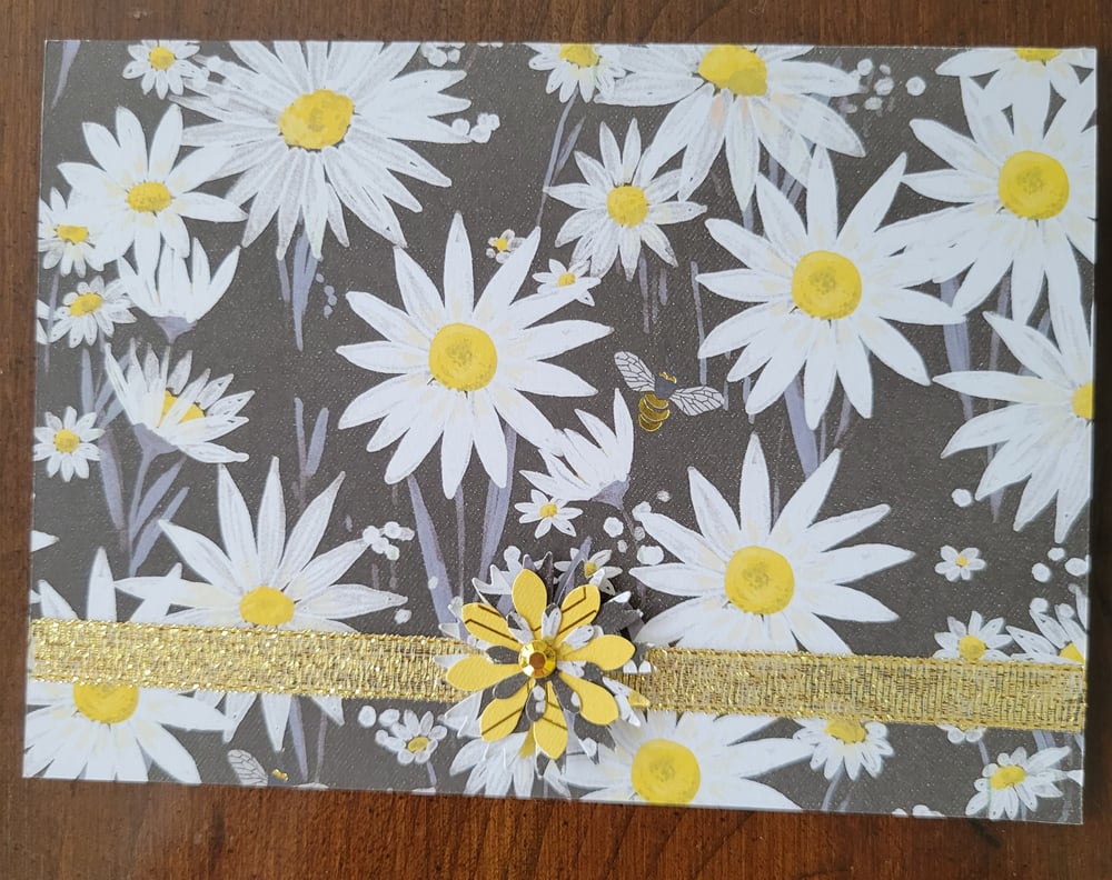 Design is as pictured- black front of card with white and yellow daisies on it.