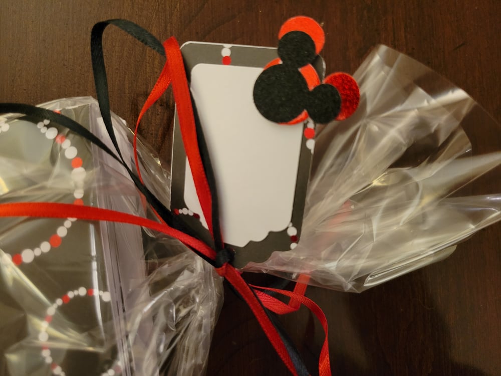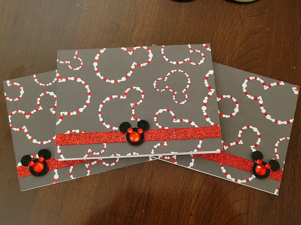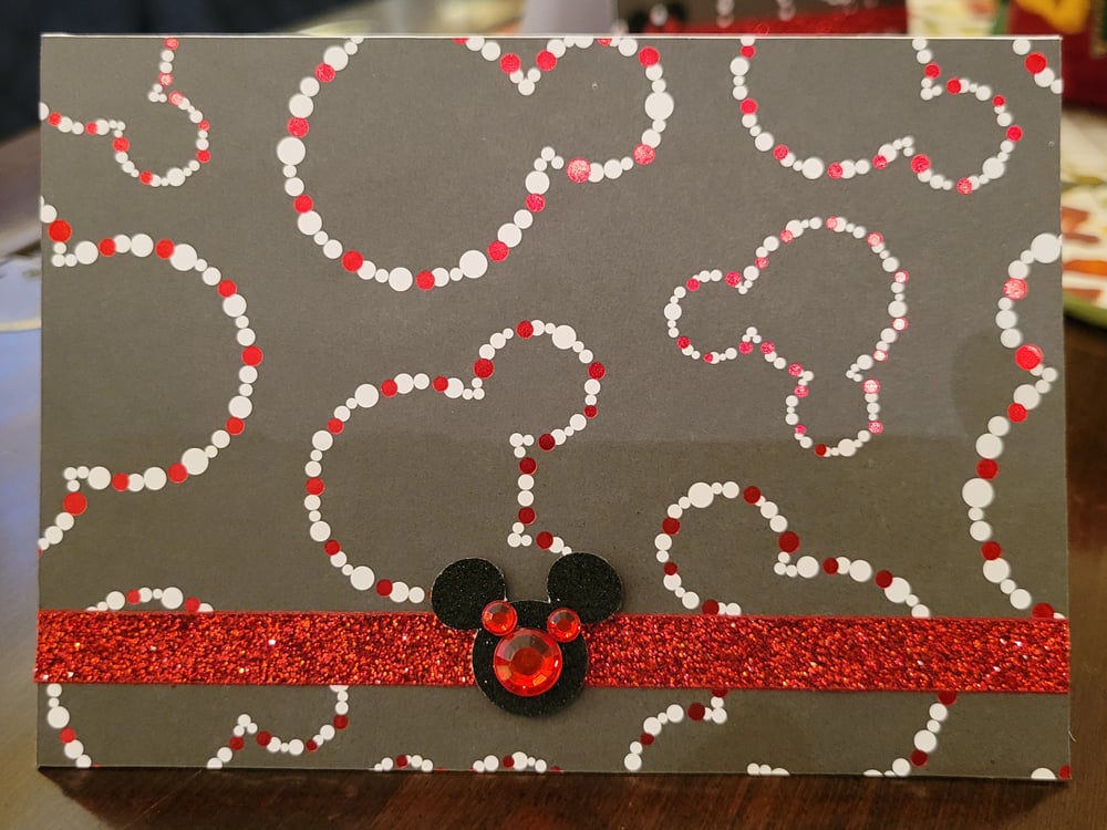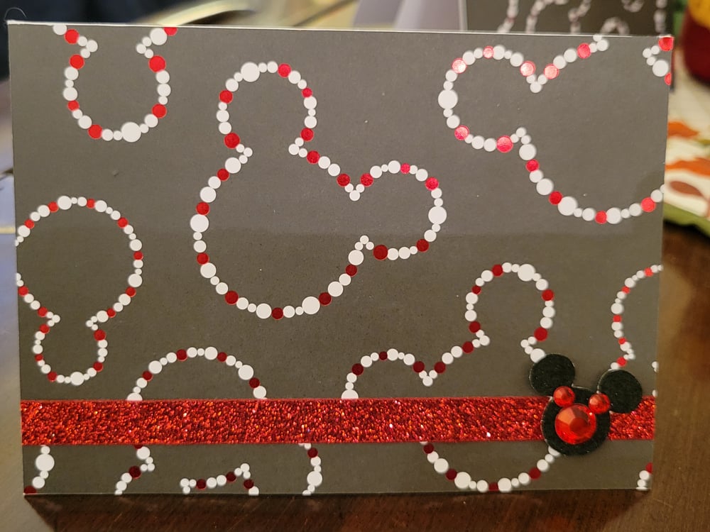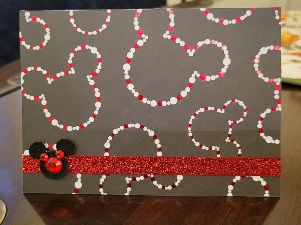 This card is embellished with a red glittery ribbon and a coordinating raised black sparkle/red gem mouse shape, alternating between the middle, right, and left sides of the card.