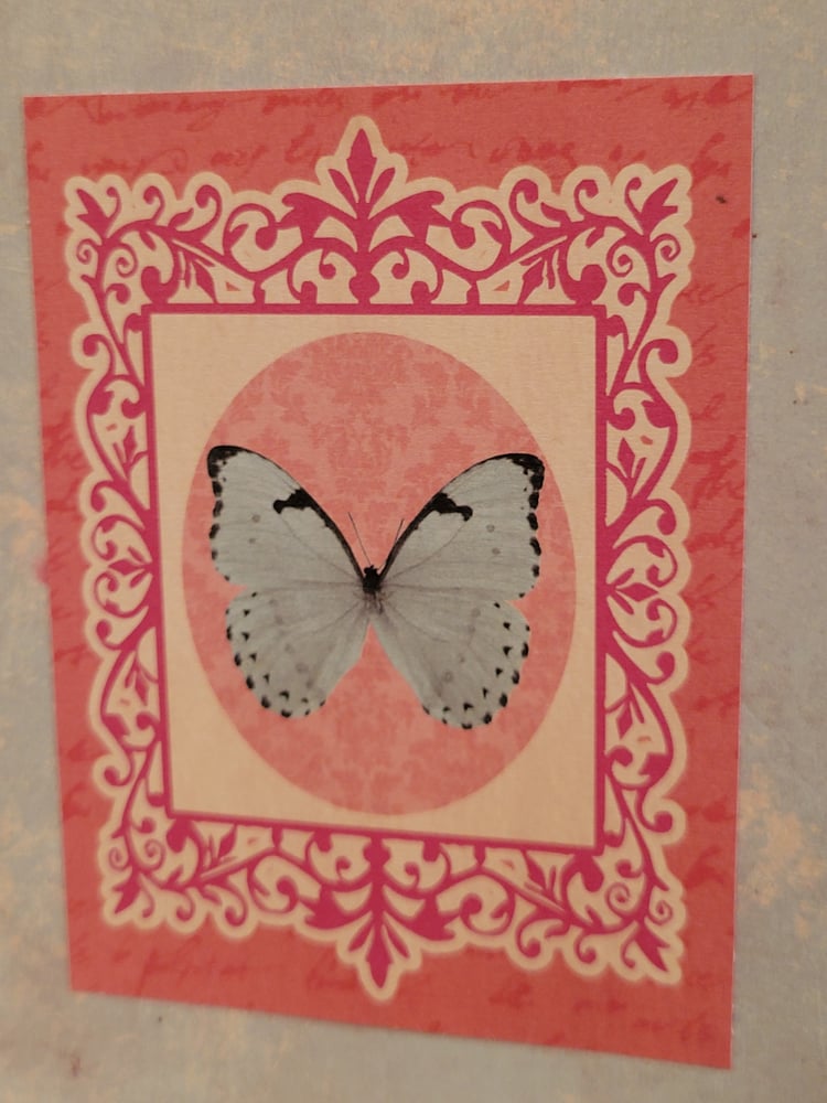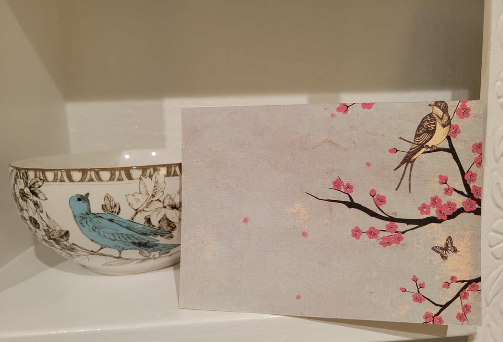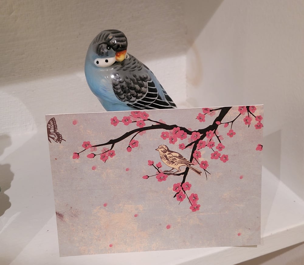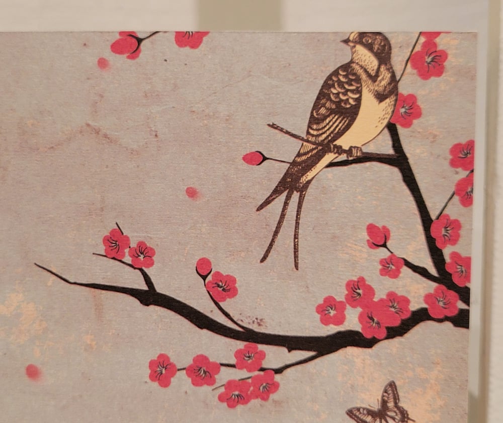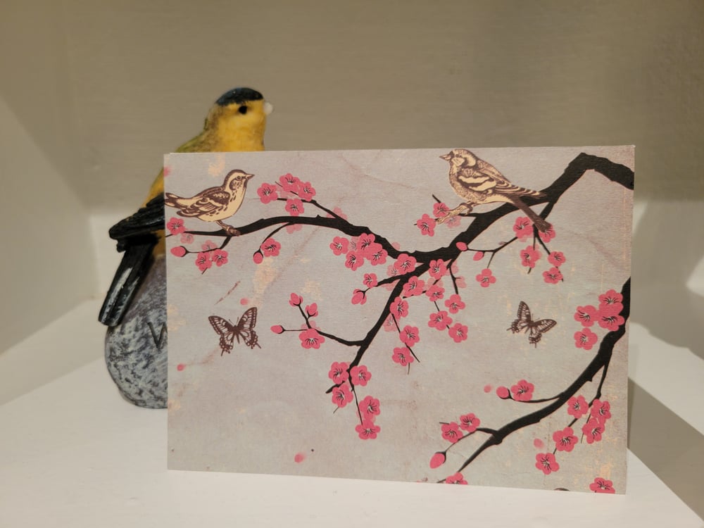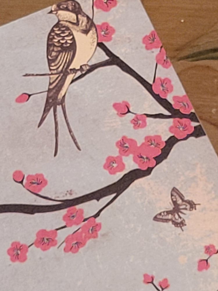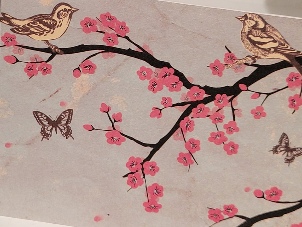 Design is as pictured- pale blue front of card with print of brown and yellow birds, brown butterflies, and flowering trees.