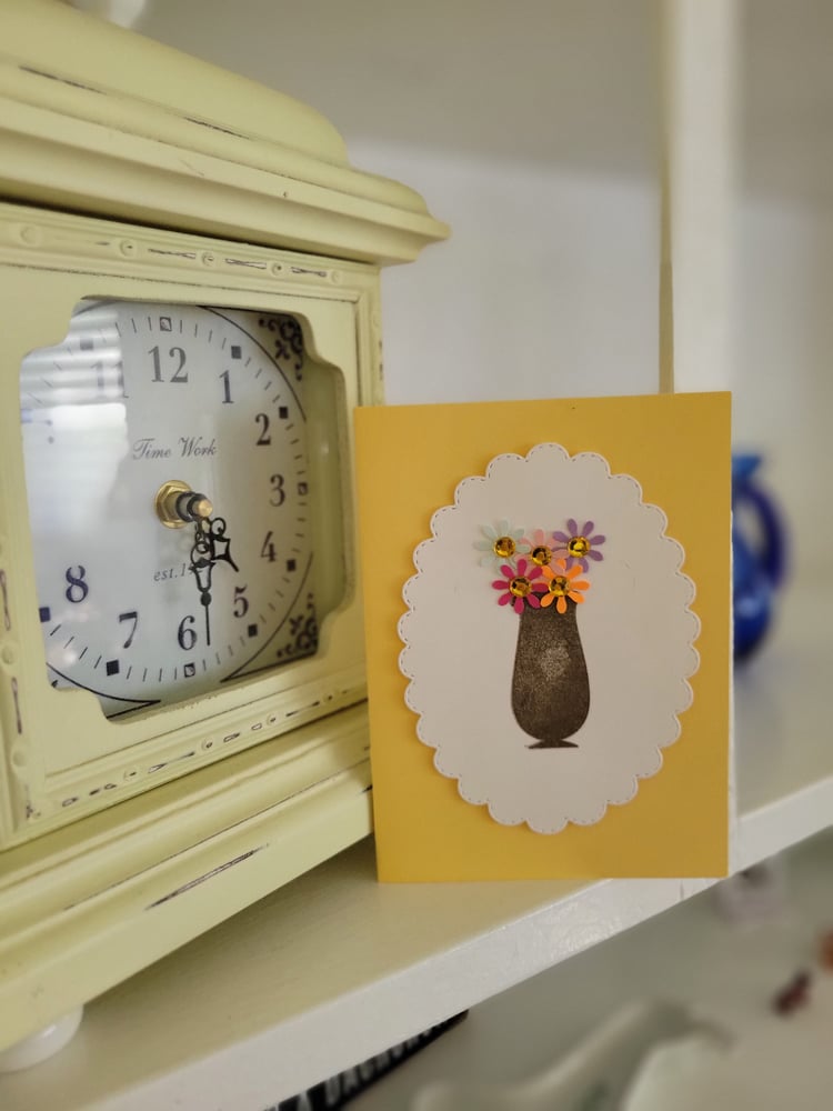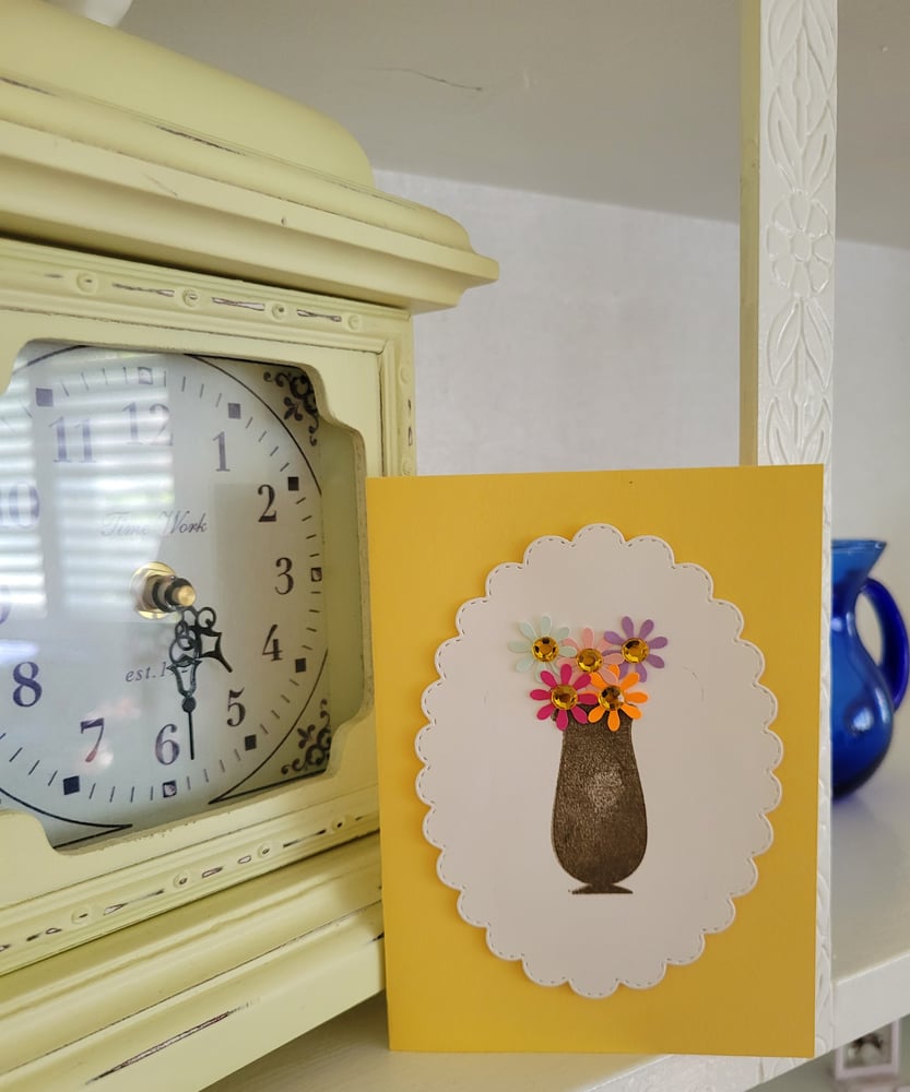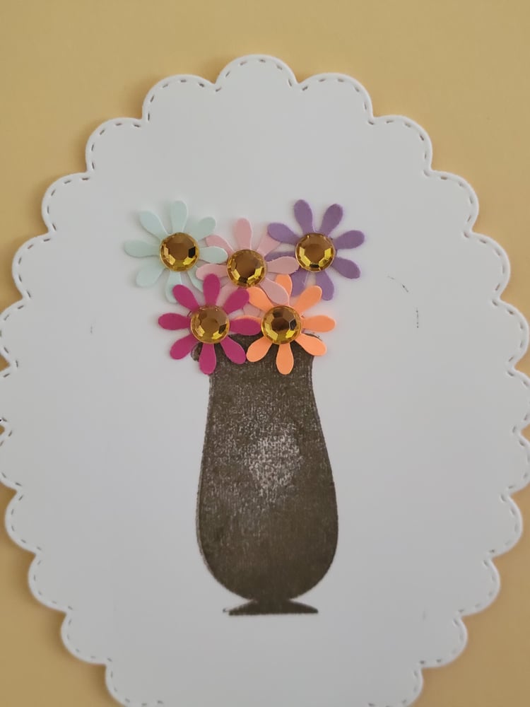 Design is as pictured; a brown vase with some sunny daisies. Daisies have a bit of bling in the center.
