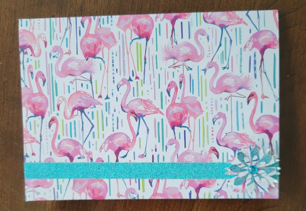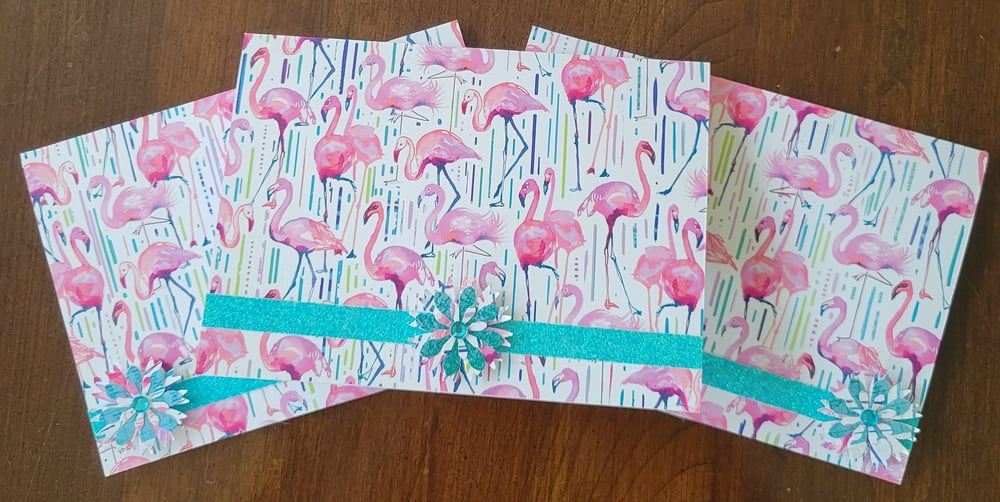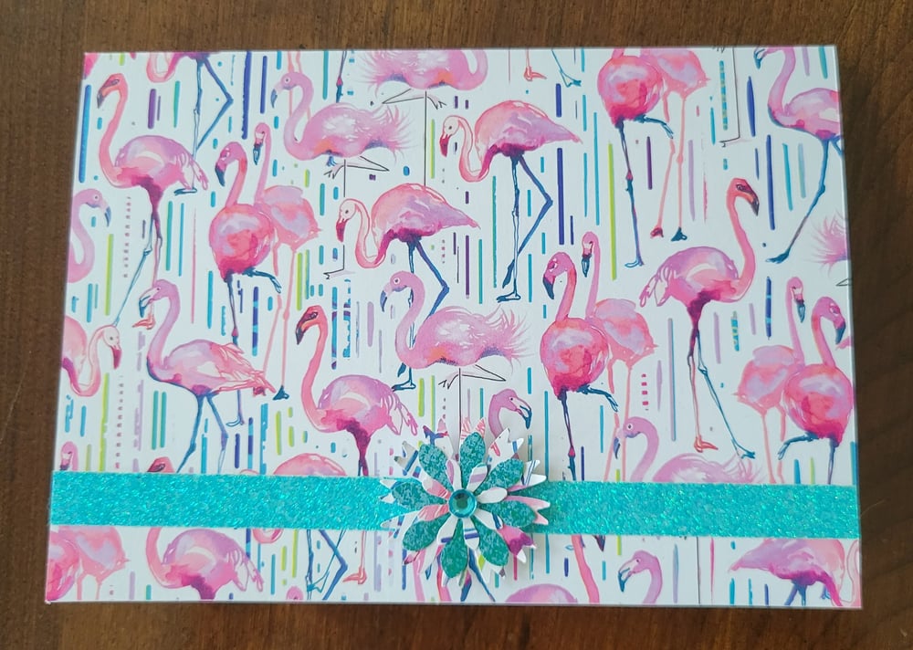 Design is as pictured- white front of card with flamingos and colorful lines on it.