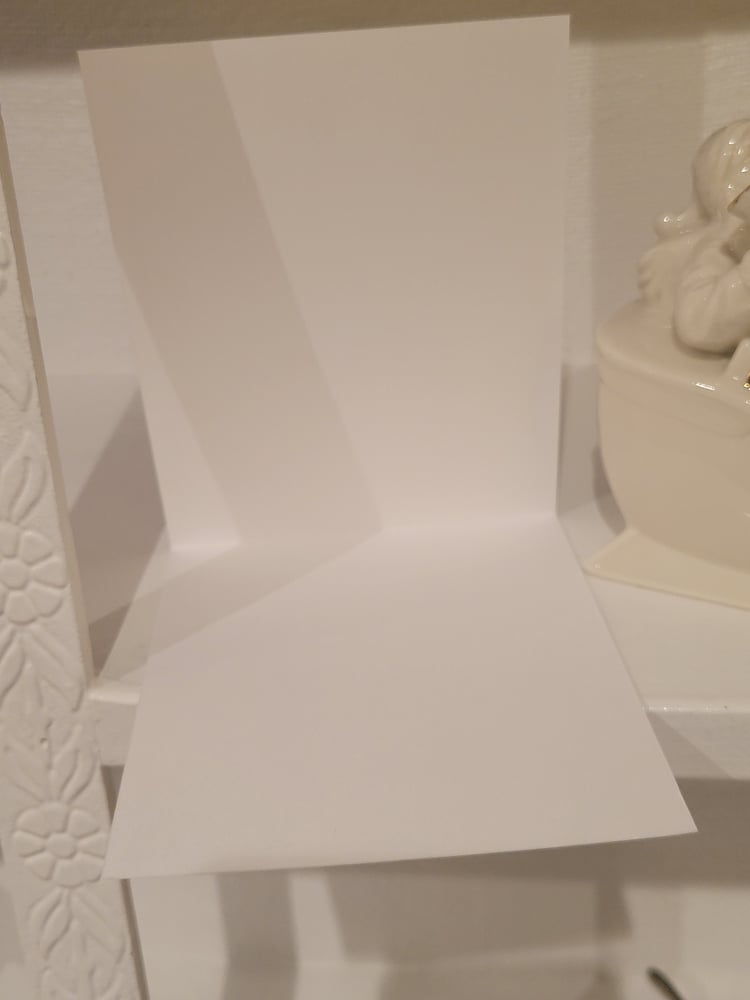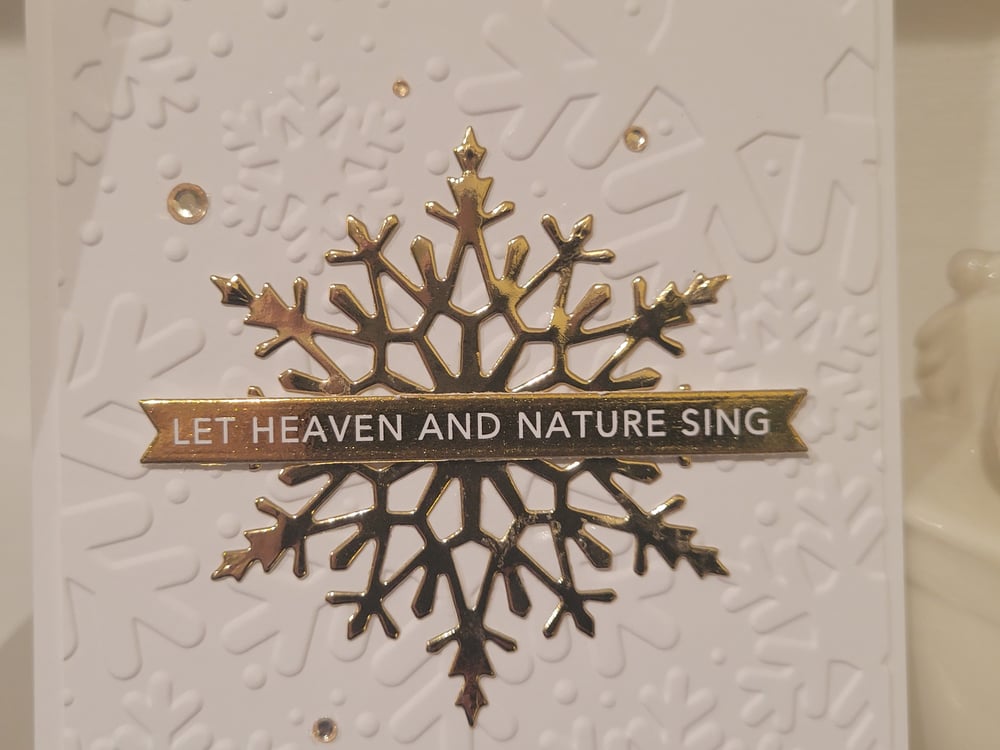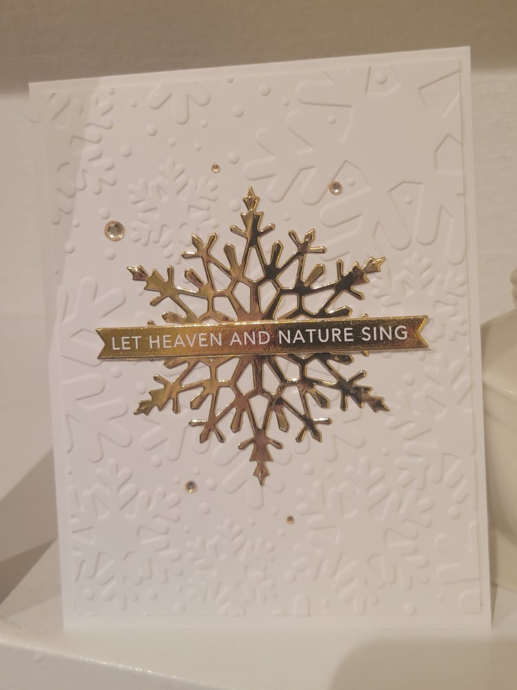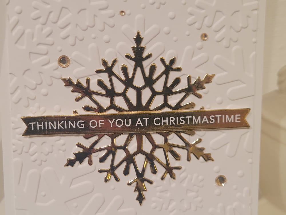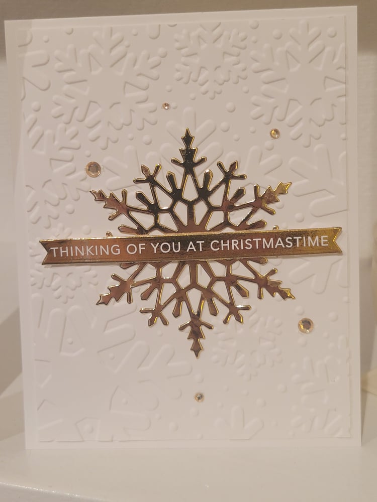 There are 3 variations of this card. All 3 cards have the same golden snowflake on top of white cardstock embossed with snowflaks, as pictured.