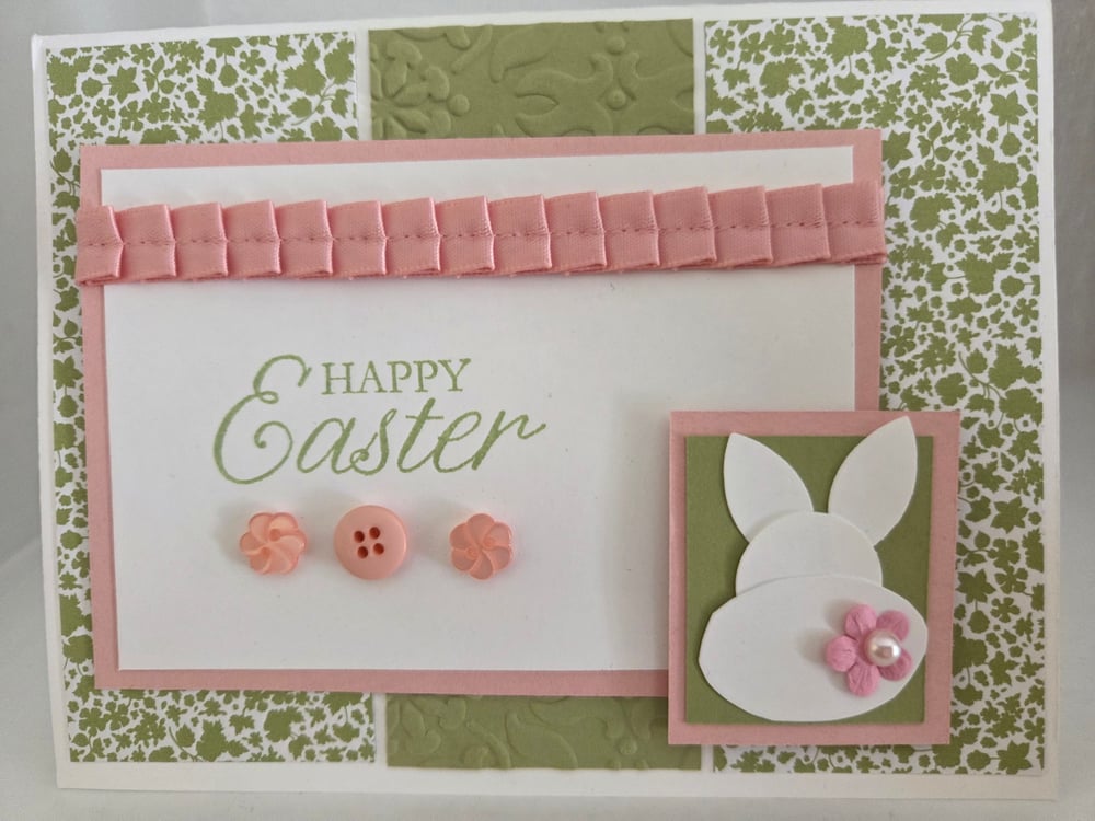 Design is as pictured- a beautiful Easter card that features a complementary green and pink color combination, sweet paper patterns, adorable pink buttons, and the cutest little bunny butt. This card is also decorated with a darling pink ruffled satin ribbon.
