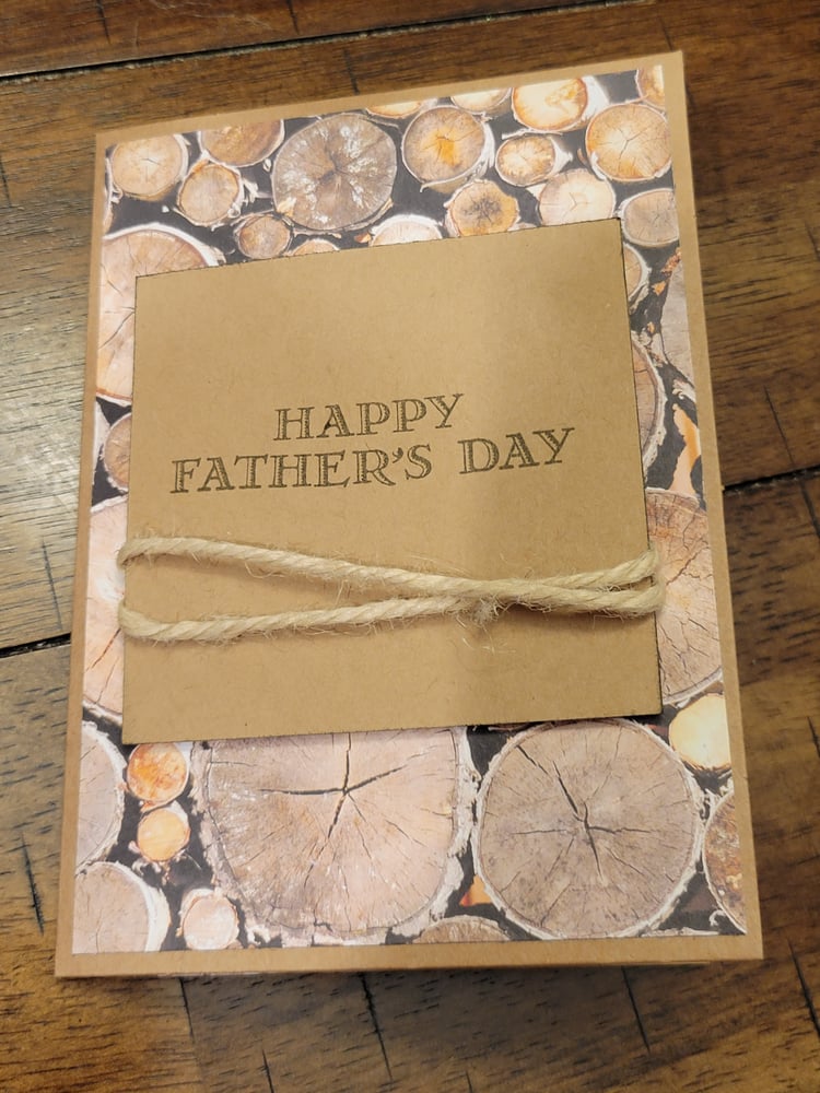 Design is as pictured. The sentiment on the front reads "Happy Father's Day," and has twine wrapped around it.