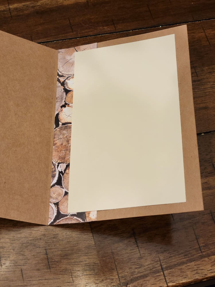 The inside of the card is the same brown "cardboard look" with a cream rectangle sits on top of a wooden log print. The inside of the card does not have a sentiment.