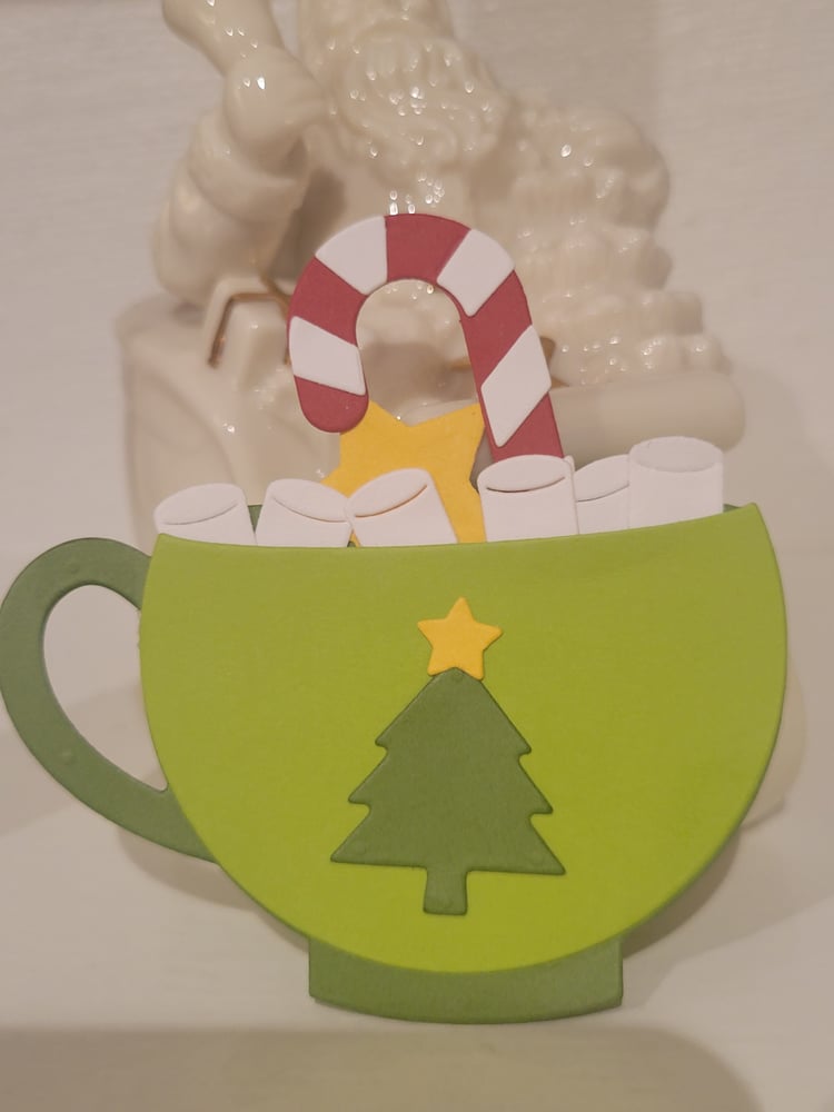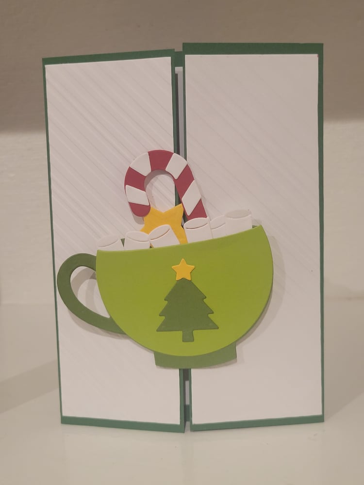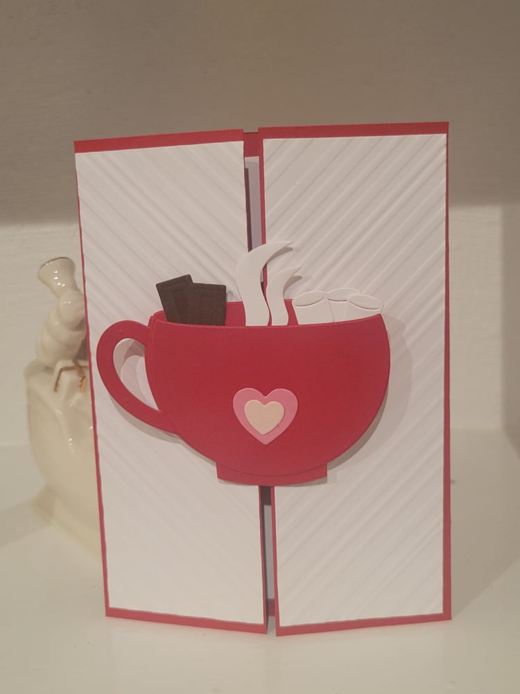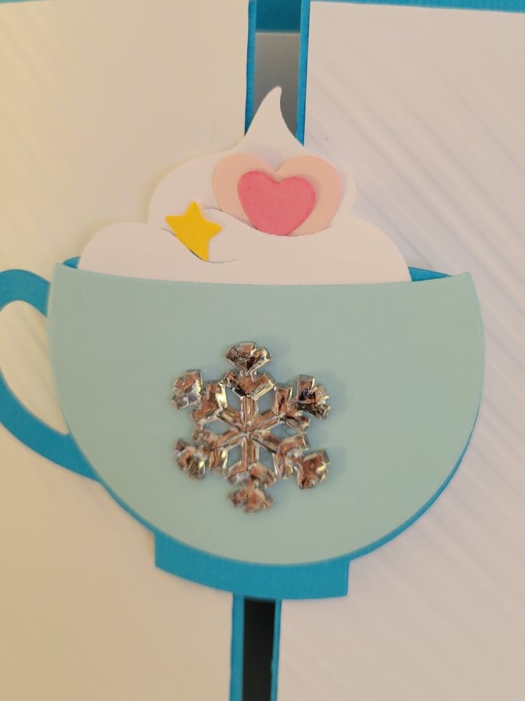 These cards are so different! They are a tri-fold that are held together by a wintery mug. The mug easily slides off and back on to open and close the card.