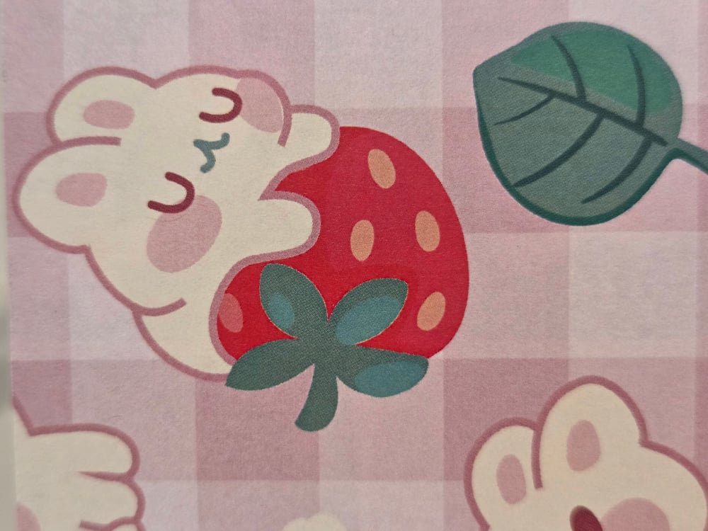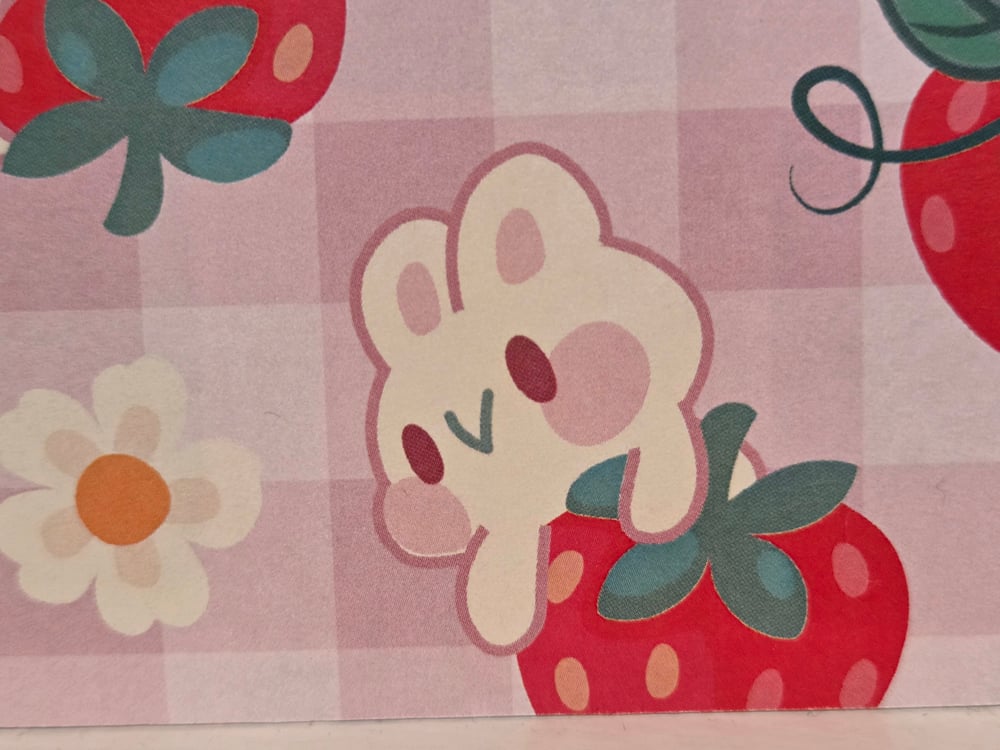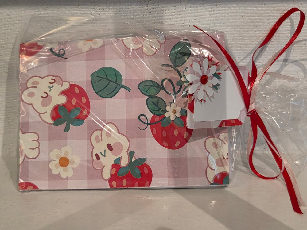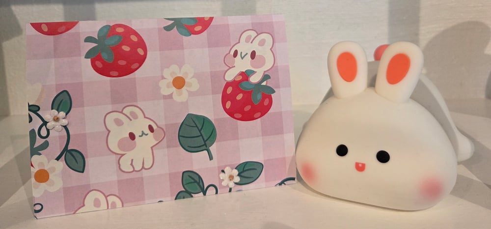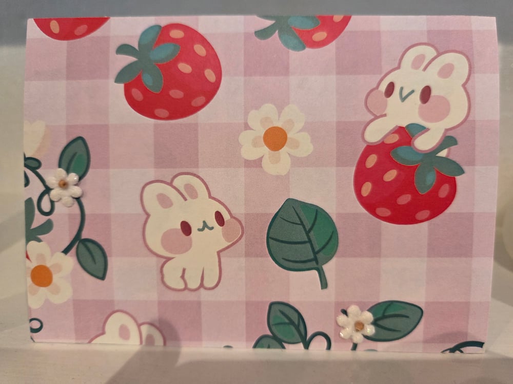 Design is as pictured- pink gingham front of card with the cutest Kawaii bunny and strawberry print. Tiny 3D daisies add the perfect accent to an already adorable set of notecards.