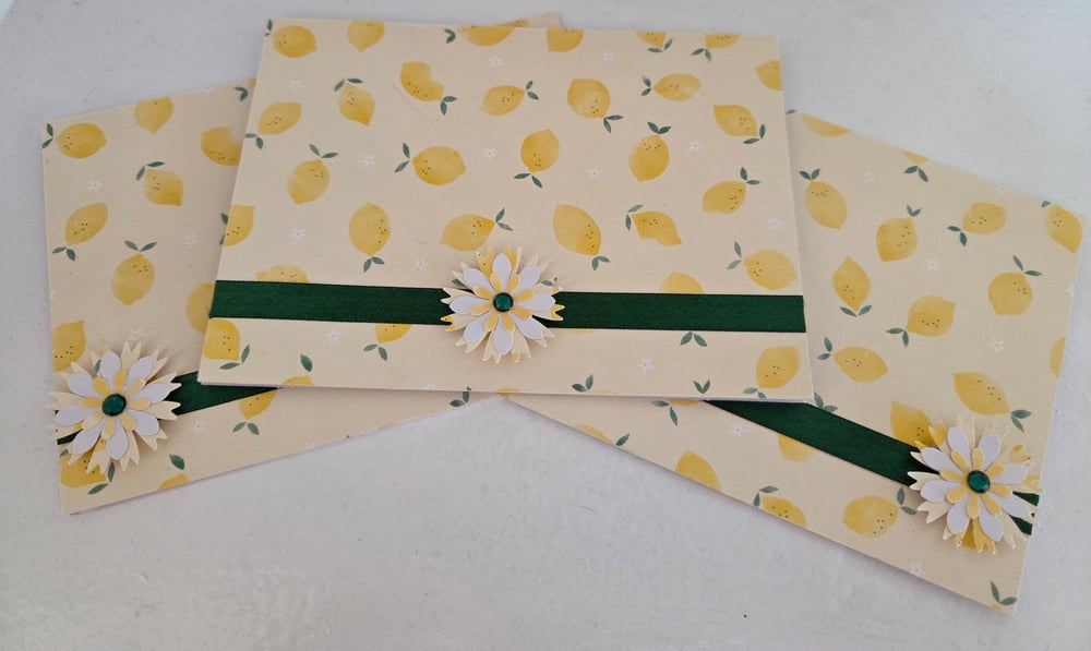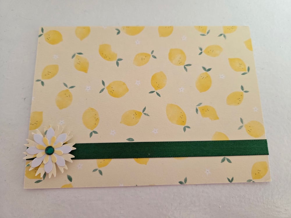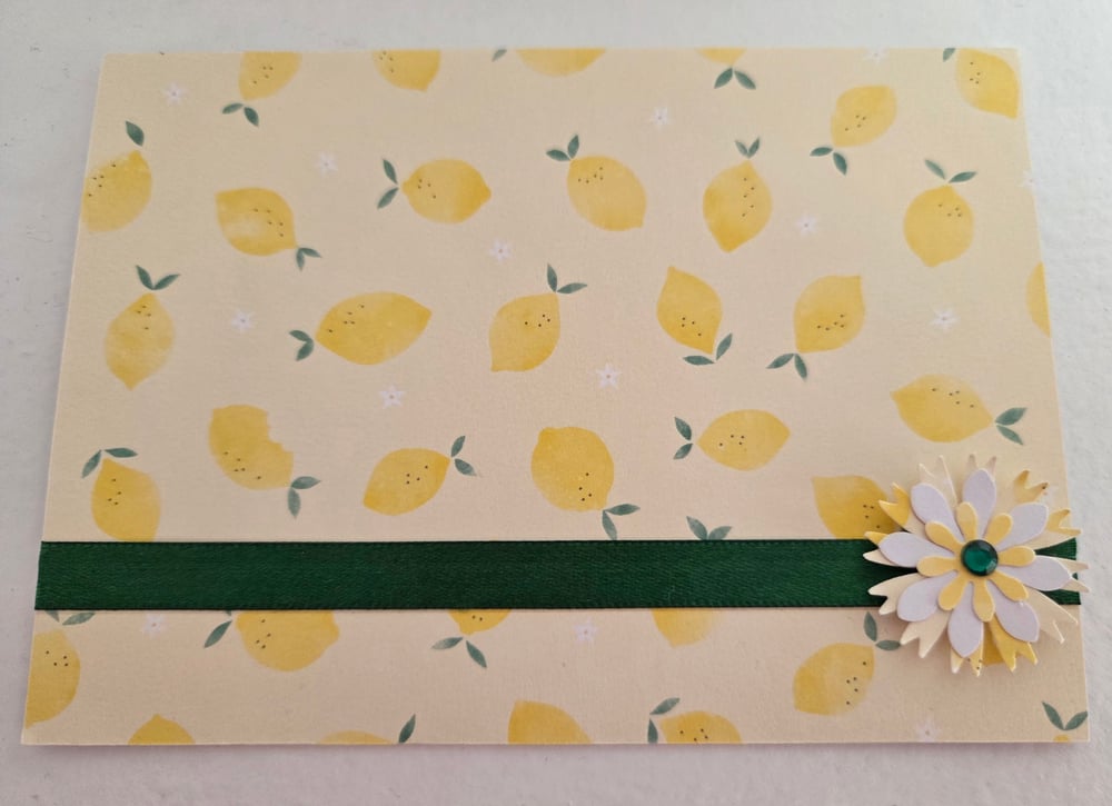 Design is as pictured- front of card is light yellow with little lemons scattered all over it. Embellished with a green satin ribbon and a coordinating 3D flower embellishment with a green rhinestone on the left, right, or in the middle.