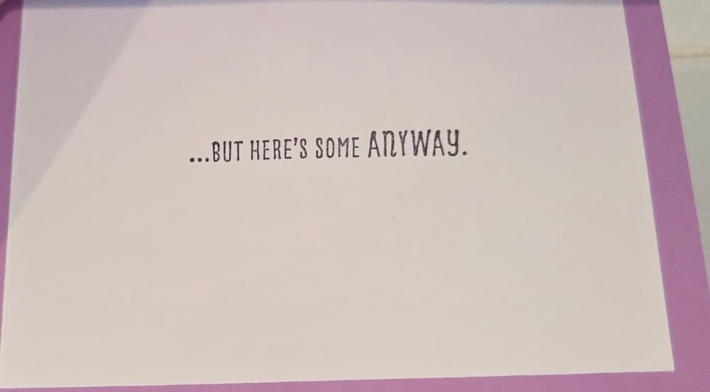 The inside of the card reads "...But Here's Some ANYWAY." There is a small 3D heart on the bottom.