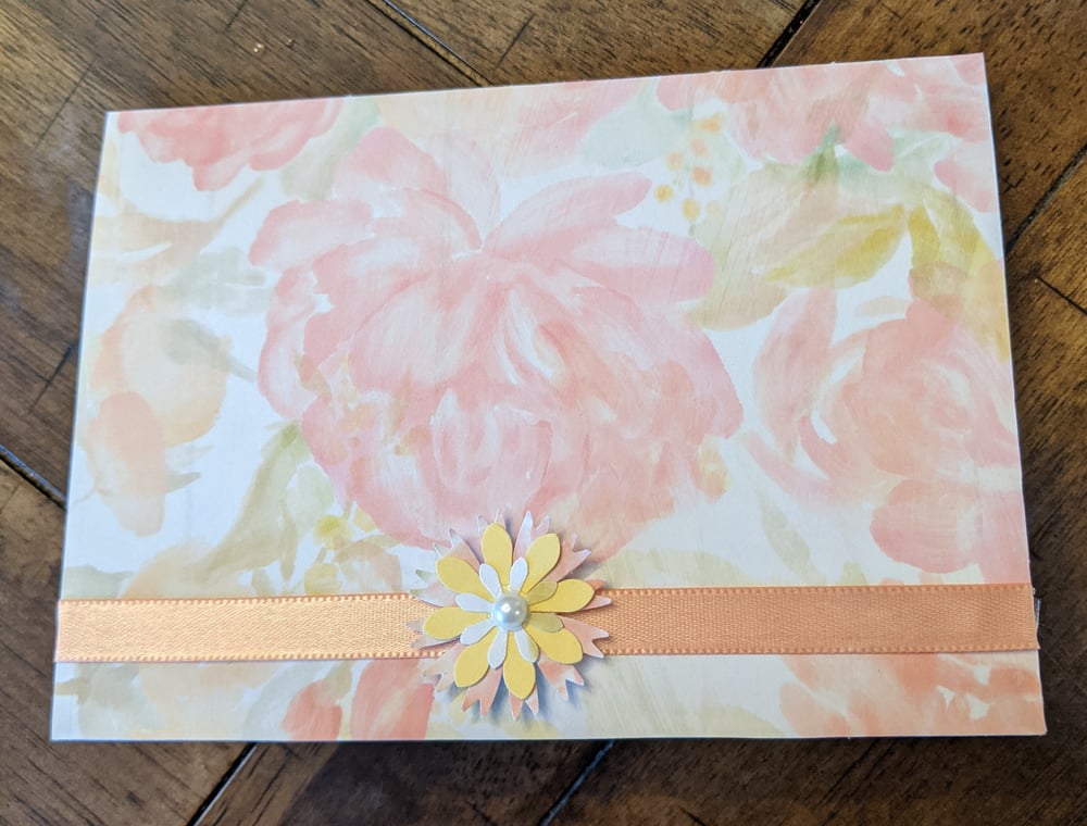 Design is as pictured- white front of card with pastel flowers on it in the softest pink, peach, and yellow colors.