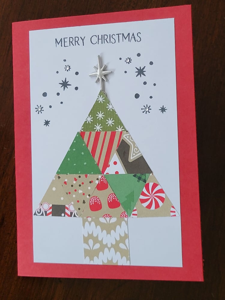Design is as pictured. The front of the card reads "Merry Christmas." Details on the front include a silver 3D star and several rhinestone embellishments.