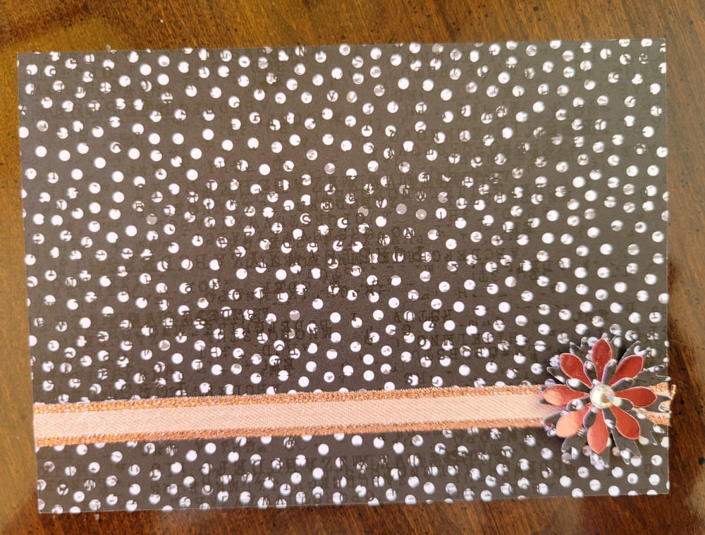 Embellished with a rose gold glittery ribbon and a coordinating raised hand made flower with a rhinestone middle, alternating between the middle, right, and left sides of the card.