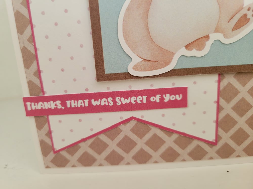 The front of the card displays a sweet brown bunny holding an equally sweet treat. It reads "Thanks, That Was Sweet of You", and features complimentary colors.