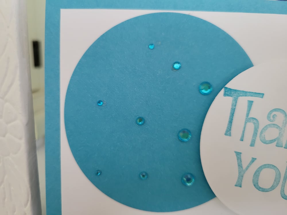 Design is as pictured; overlapping circles that read "Thank You." There are 3 blue rhinestone rays on the larger circle.
