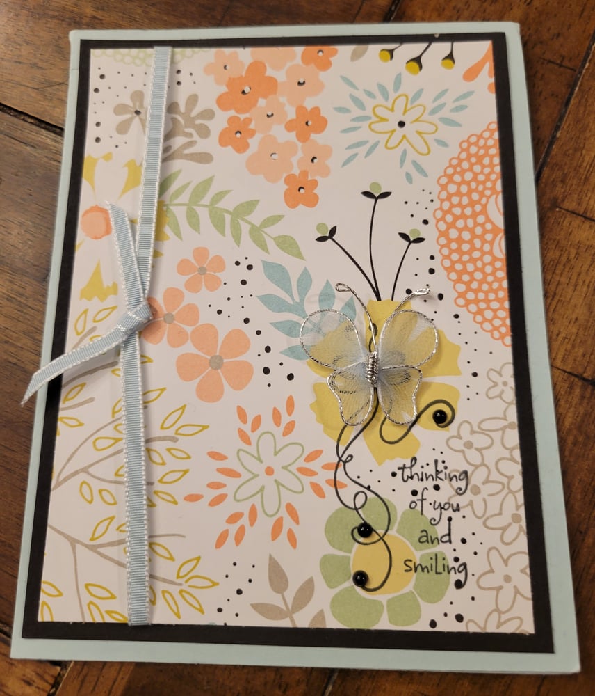 Design is as pictured. The card is light blue and the sentiment on the front reads "Thinking of you and smiling." The card also includes a raised wire butterfly