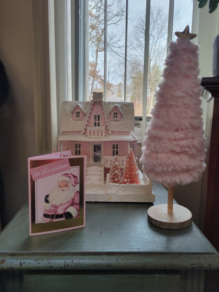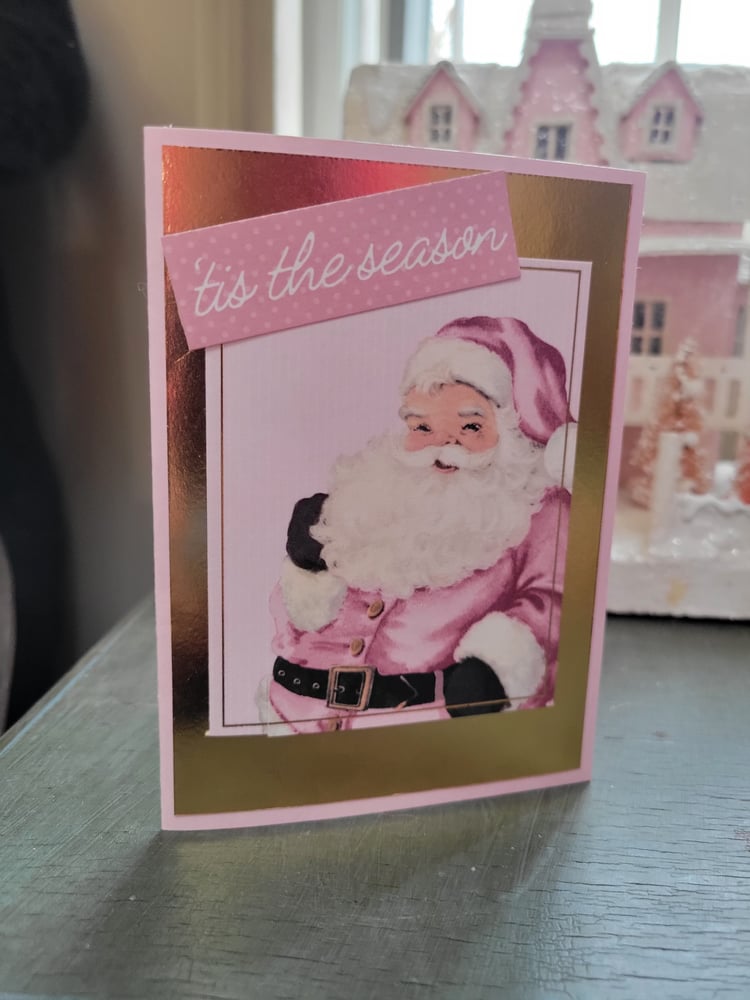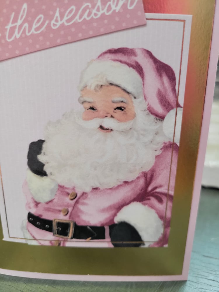 The front of the card is pink on shiny gold on pink and reads "tis the season" in gold foil. It also features an adorable vintage Santa decked out in pink and white.
