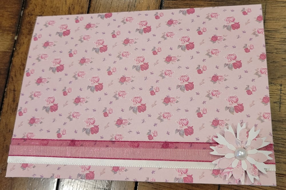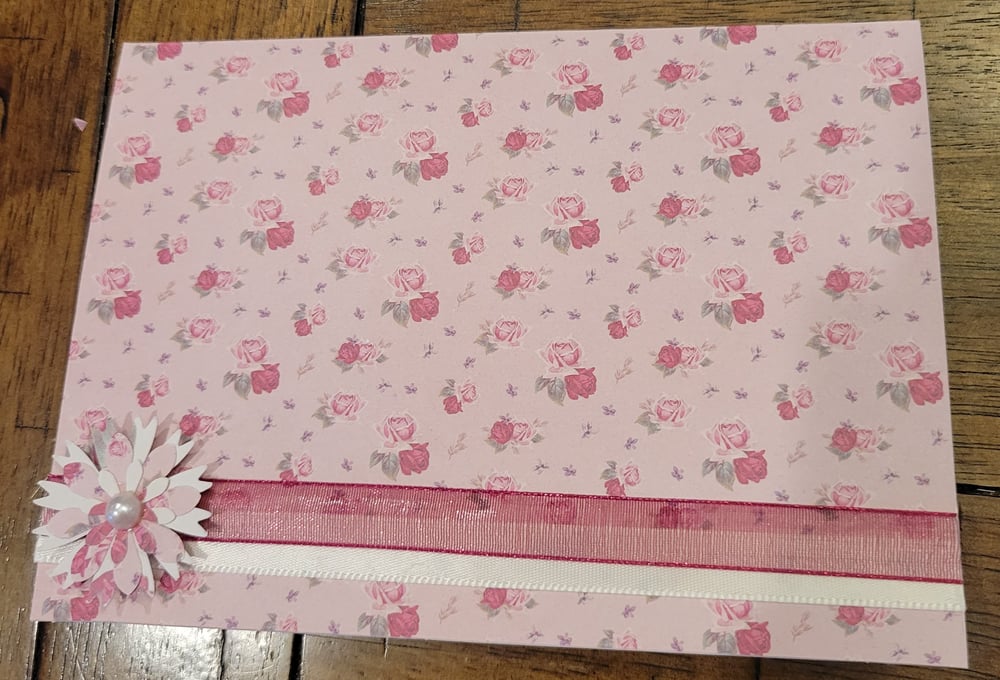 Design is as pictured- pink front of card with gorgeous vintage tea rose design on it.
