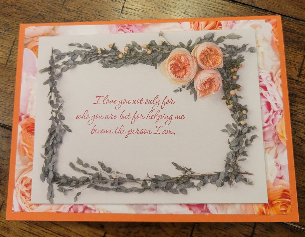 Design is as pictured. The sentiment on the front reads "I love you not only for who you are but for helping me become the person I am."